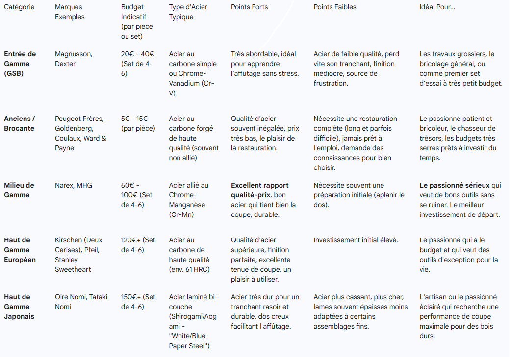 C'est avec cette philosophie en tête que nous allons maintenant aborder le choix de vos premiers outils. Vous êtes là, devant le rayon, ou peut-être en train de faire défiler des pages interminables en ligne. D'un côté, un set de ciseaux à bois de grande surface à 20€. De l'autre, des merveilles allemandes ou japonaises qui coûtent le prix d'un outil électroportatif. Lequel choisir? Cette confusion est normale et partagée par une immense majorité de menuisiers passionnés. Notre mission aujourd'hui est de vous donner toutes les clés pour choisir le set qui correspondra parfaitement à votre budget, vos ambitions et qui vous mettra sur la voie du plaisir de travailler le bois.