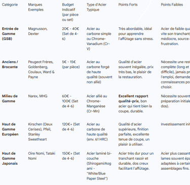 Points Faibles : La qualité de l'acier est leur plus grand défaut. Il est souvent trop tendre, ce qui signifie que le tranchant s'émousse très rapidement, vous forçant à réaffûter constamment. Le dos de la lame est rarement plat, ce qui est un handicap majeur pour un travail de précision. L'expérience peut vite devenir frustrante.